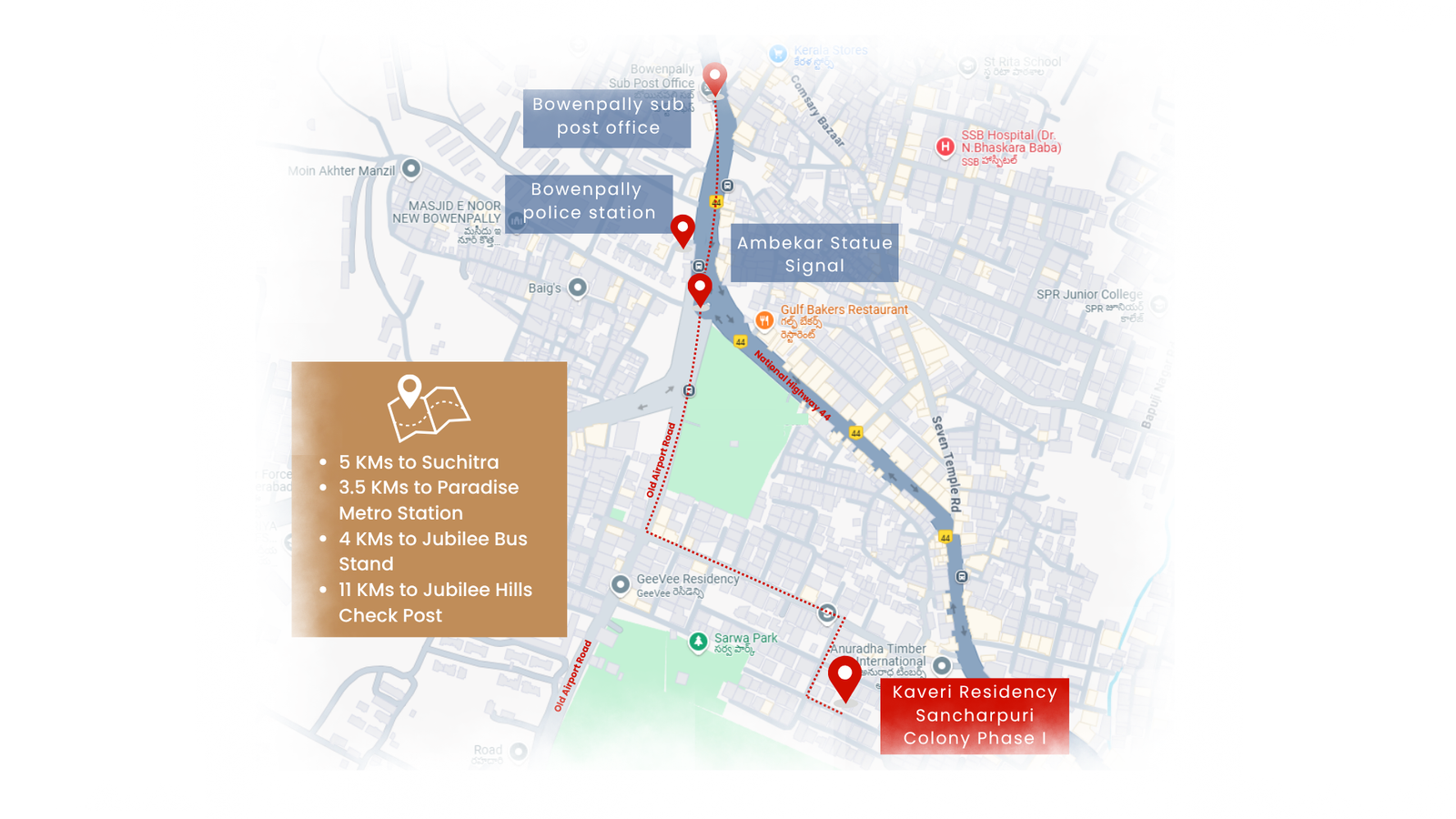 Strategically located in the heart of Sancharpuri Colony, Kaveri Residency brings together thoughtful living and practical convenience in one of Bowenpally’s most well-established neighborhoods.